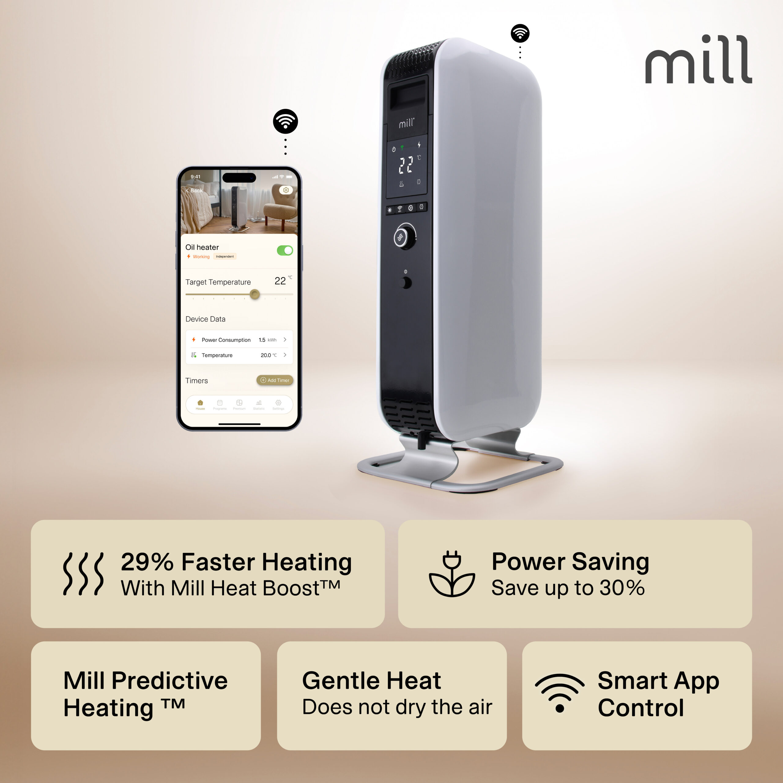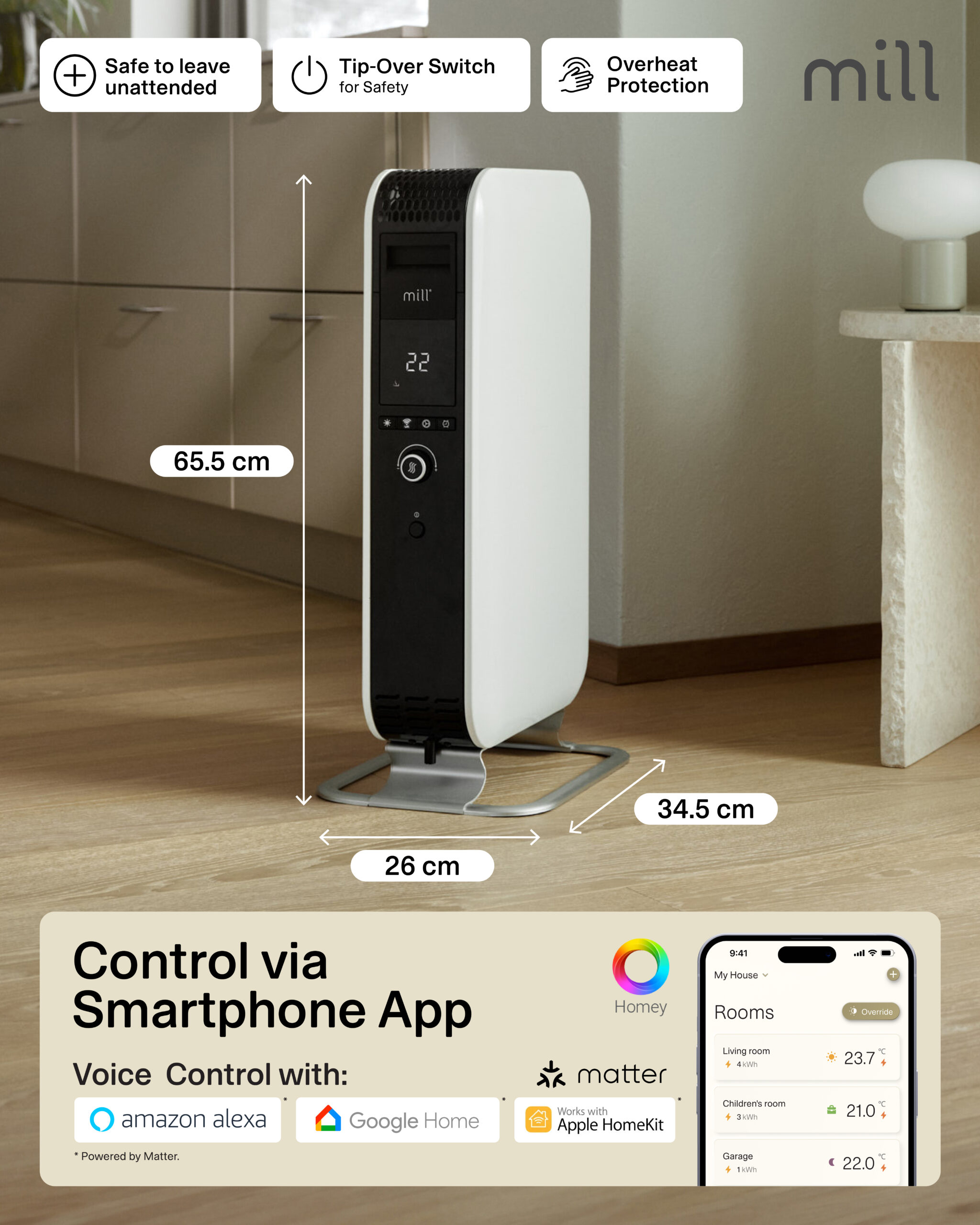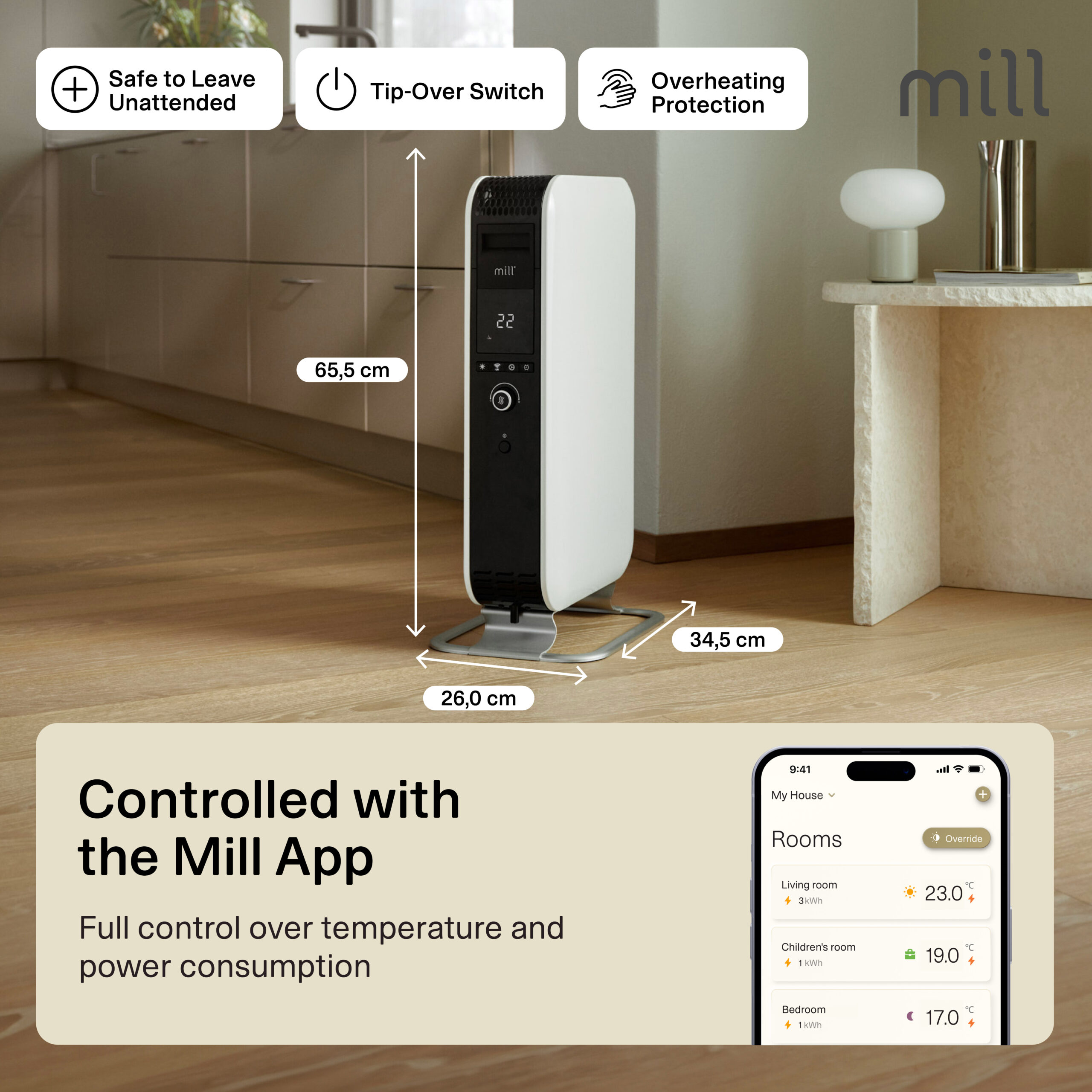 With its unique closed shape, the heater spreads the heat around the room a lot faster compared to traditional oil-filled radiators. This makes it heat up a room 29% faster, as the closed shape forces the hot air to rise faster, distributing the heat more efficiently. We call it Mill Heat Boost Technology.