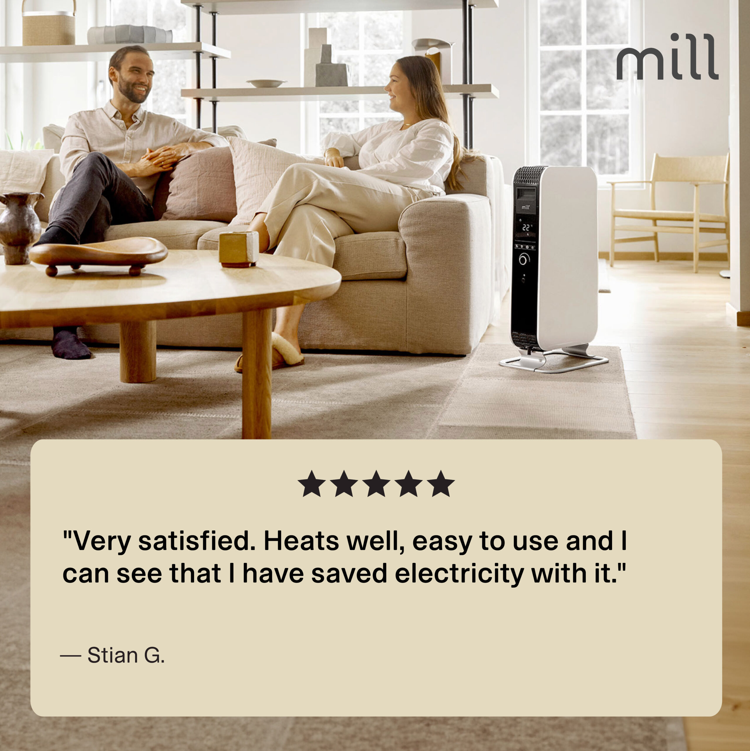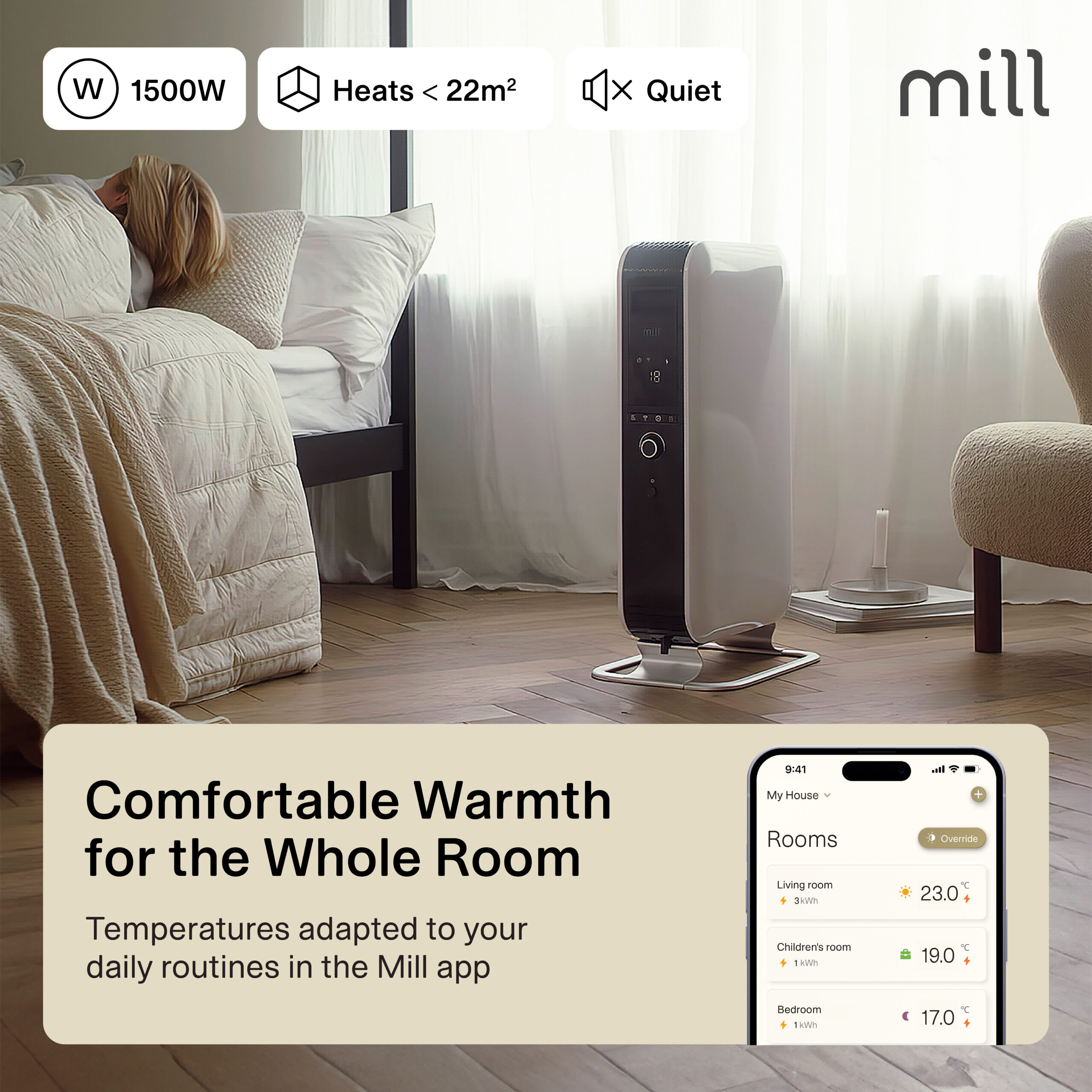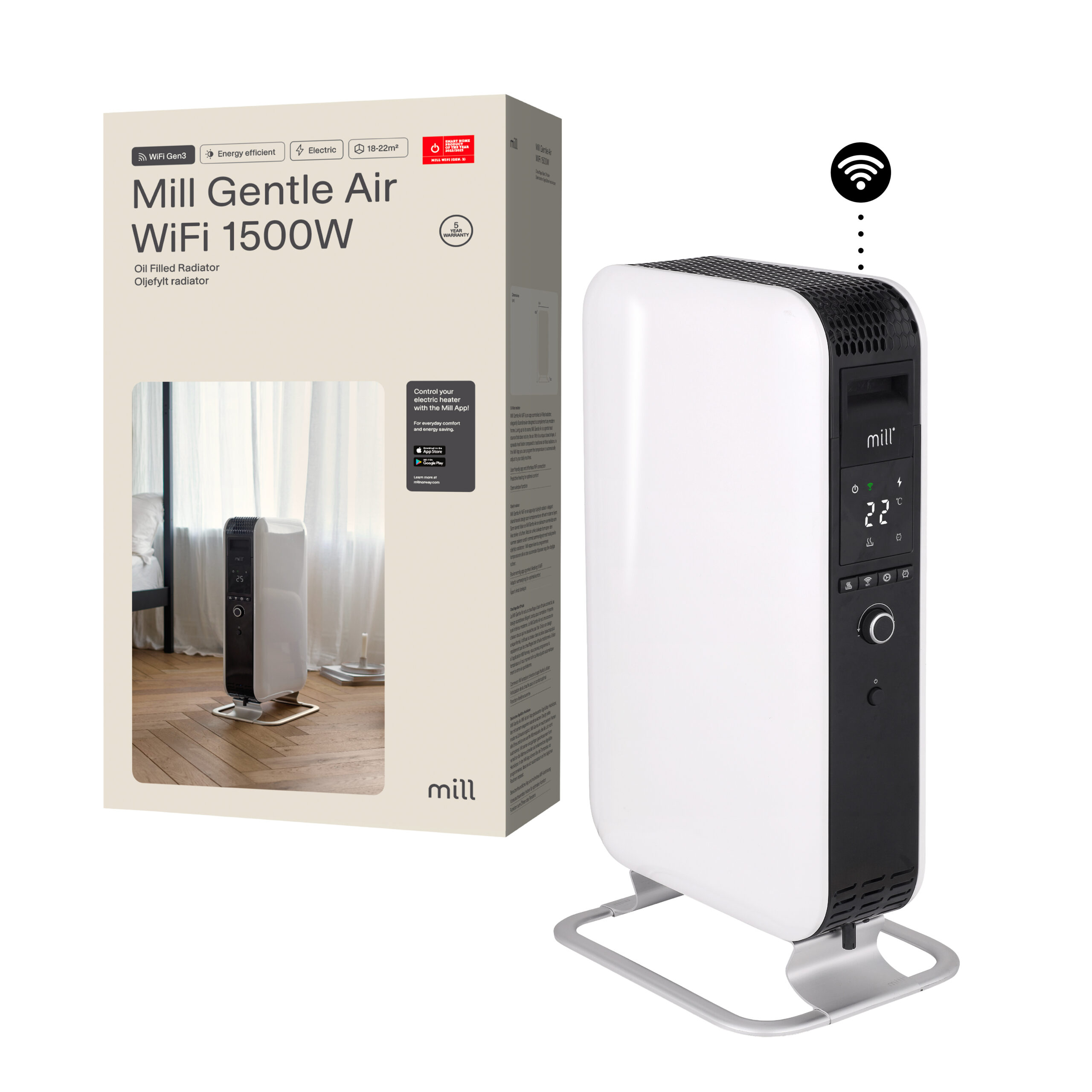 With its unique closed shape, the heater spreads the heat around the room a lot faster compared to traditional oil-filled radiators. This makes it heat up a room 29% faster, as the closed shape forces the hot air to rise faster, distributing the heat more efficiently. We call it Mill Heat Boost Technology.